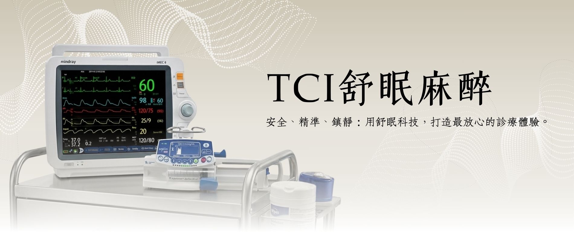 TCI 舒眠麻醉(又稱標靶控制輸注)是一種精準的淺中度鎮靜技術。透過電腦程式根據患者的年齡、體重、身高進行精密計算,自動給予最合適的藥量,讓患者進入如「深度睡眠」般的放鬆狀態。